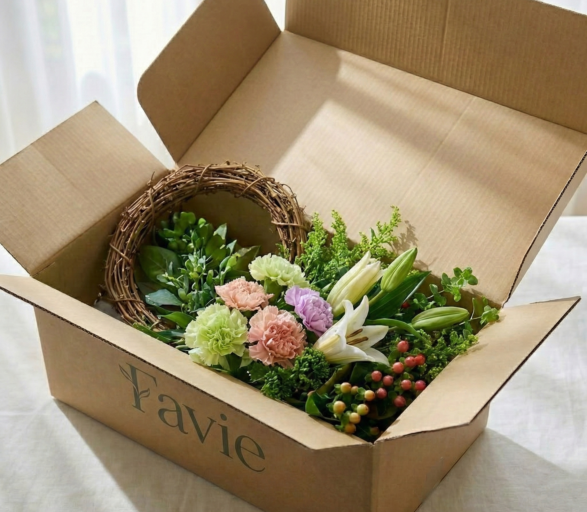 フローリストが市場で厳選した花材を使用した、フラワーアレンジメントの制作キットをお送りいたします。